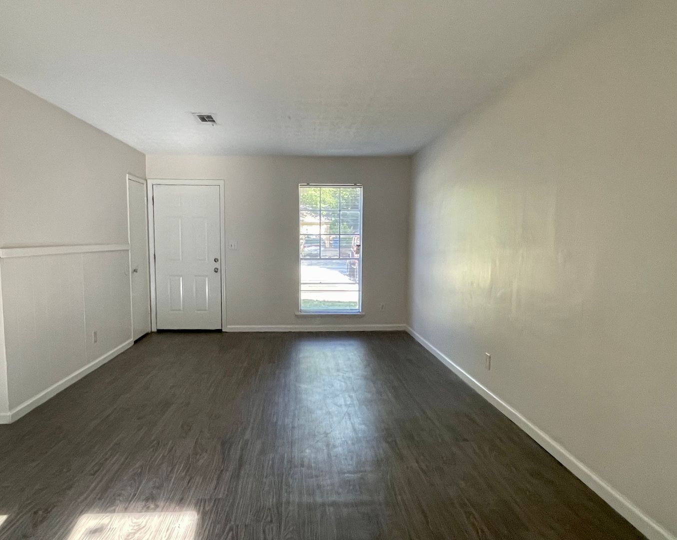 A Large Living/Dining Room Combo w/ LVP Flooring and French Doors that Open Onto the Backyard.